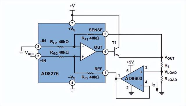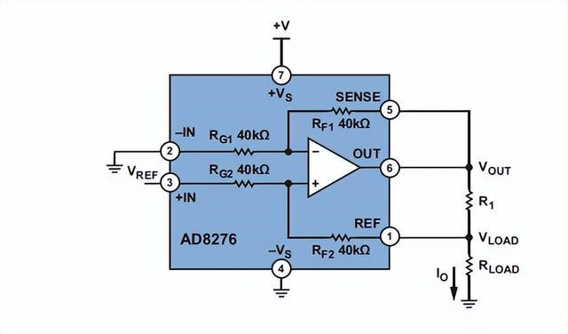 精密電流源傳統上采用運算放大器、電阻和其它分立器件構建,但存在尺寸、精度和溫度漂移等方面的不足。如今,高精度、低功耗、低成本集成差動放大器的AD8276使得尺寸更小、性能更高的電流源變成現實(如圖5)。反饋緩沖器使用低失調、低偏置電流放大器,例如ADA4098-2、ADA4622-2、AD8610、AD8603等具體取決于所需電流范圍。