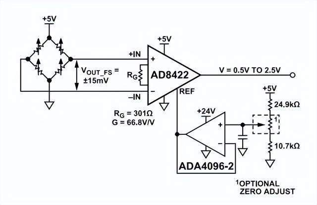 AD8422是業界標準AD620發展到第三代的產品。具有極低的偏置電流,高源阻抗時不會產生誤差,允許多個傳感器多路復用至輸入端。低電壓噪聲和低電流噪聲特性使AD8422成為測量惠斯通電橋的理想選擇。