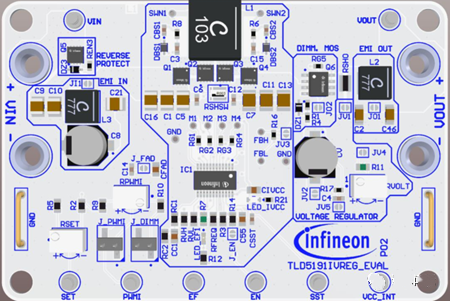 隨著LED工藝技術的發展,LED應用也越來越廣泛,與之對應的LED驅動技術也在不斷發展,而汽車LED驅動的要求也要比民用照明的LED驅動的要求高得多,民用照明的LED驅動甚至只需要一個整流電路即可接入燈珠串,但是對于由電池供電的汽車LED就不能滿足需求。英飛凌作為汽車電子的主要元件廠商,近年來推出了很多高效、安全、功能豐富的LED驅動控制芯片,今天要說的這塊TLD5191IVREG-EVAL評估板,就是以英飛凌TLD5191為控制核心的。